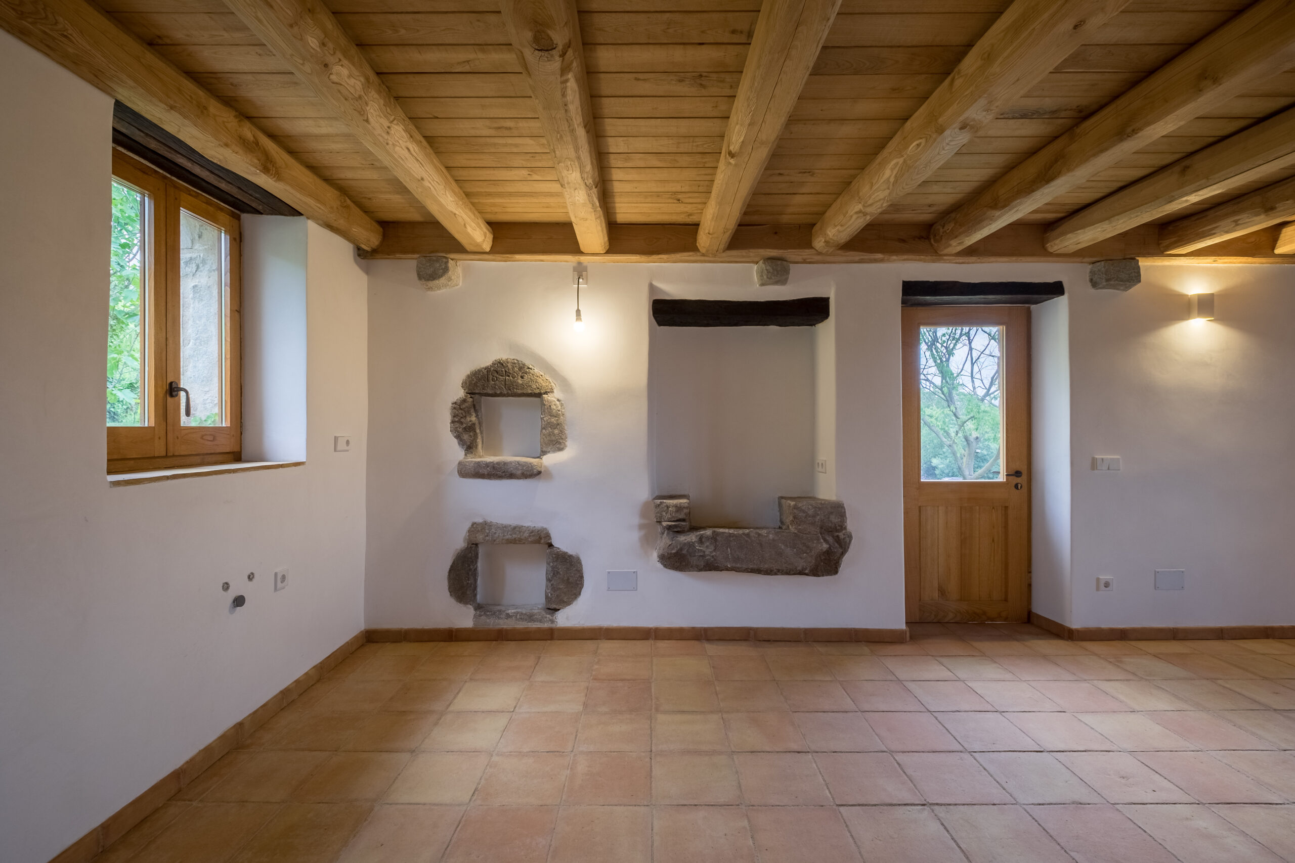 La intervenció ha respectat l’estructura original de murs de pedra, aïllats amb morter de calç i suro natural per millorar el confort tèrmic i la transpirabilitat dels materials. Els acabats amb remolinats de calç conserven la textura i el caràcter propi de l’arquitectura tradicional catalana. Els forjats de bigues i entrebigat de castanyer reprodueixen els sistemes originals, mantenint la coherència estètica i constructiva de la masia.
