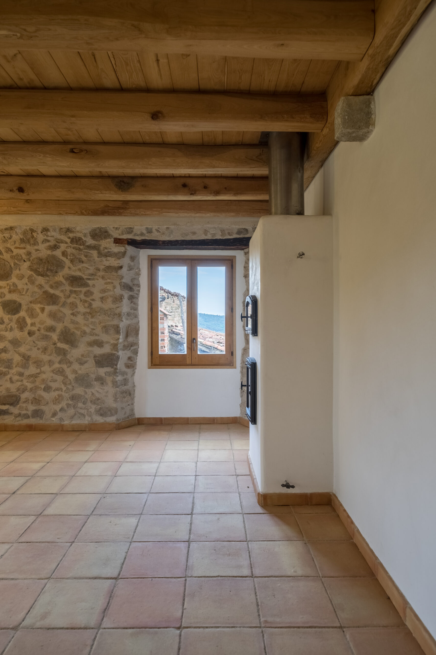 Per al sistema de calefacció, s’ha optat per una estufa d’inèrcia capaç d’escalfar tota la casa de manera eficient i amb un consum mínim d’energia, en coherència amb la visió d’una arquitectura responsable amb el medi ambient.